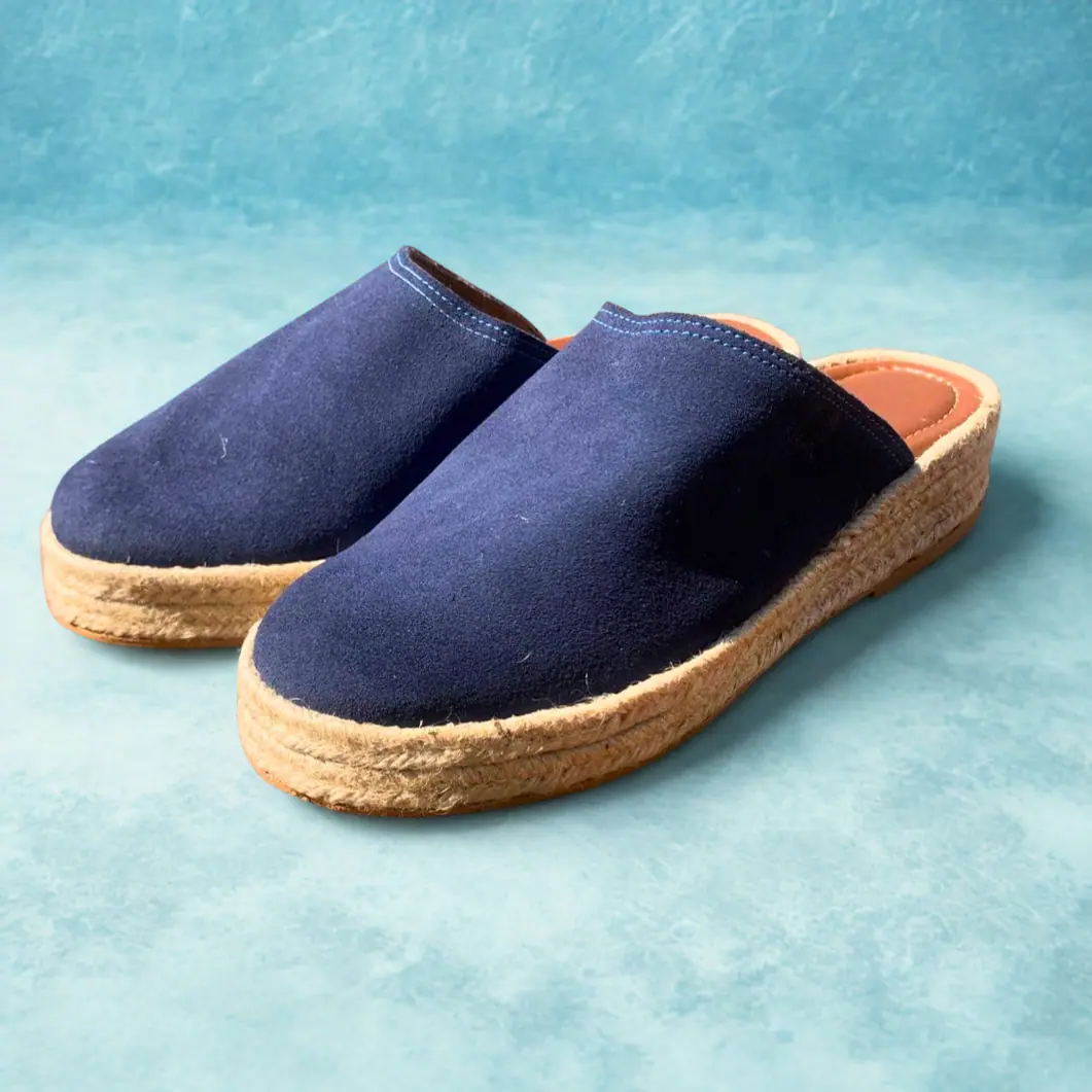 A camurça azul marinho traz profundidade e sofisticação, enquanto o solado em corda reforça a leveza da peça.